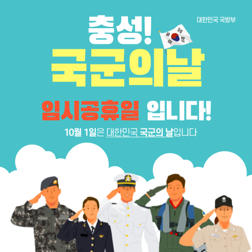 지난 9 월 3 일, 정부는 10 월 1 일을 임시공휴일로 지정한다고 발표했습니다.국군의 날을 기념하고 군의 중요성을 널리 알리기 위해서라고 하네요. 이번 조치는 국군의 날의 의미를 되새기고, 군인들과 그 가족들, 그리고 국민 전체가 이 날을 특별하게 기억할 수 있도록 하기 위한 결정이라고 합니다.